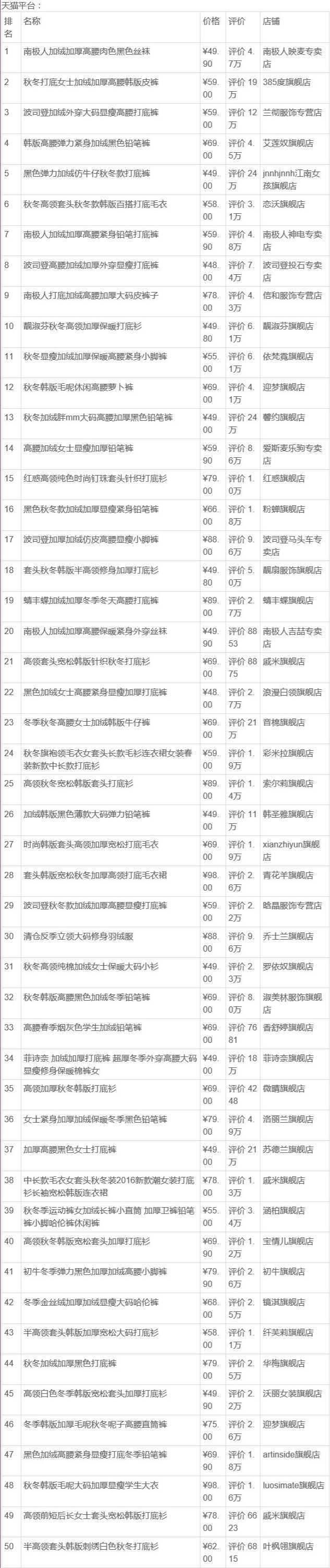 ①在天猫京东合前100销售款中,45-99价位段款数最多的是波司登与南极人,各4款,这4款主要是女孩们的裤子、等等; ②100-199价位销量最多的是香榭亿恋,有4款在这个价位,之后是浪漫女人、暖盈好、衣度百科各有3款; 从这几个图谱结合我们之前分析的内衣数据,我们会发现波司登与南极人这些品牌在羽绒服到内衣,再到都有他们的身影,但这些大品牌在冬天也没能抢占大部分的份额,这对于创业者,新品牌是一个好的信号,我们依然可以大胆规划我们的蓝图,设计、创作出年轻一代女孩们喜爱的具有个性化、时尚又价格合适的服装,为自己大品牌梦想打下坚牢的基础。 仁者见仁,智者见智,详情数据在以下,需要详细分析的,请自己拿去好好研究,会对你的学识、事业、创业、战略策略有所帮助。
