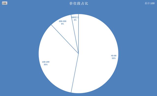 综合几个数据得出,100远左右价位的占了88%的份额,与我们之前分析的内衣数据差不多,这个价位段的一直是销售最旺盛的区域,200以上就急剧减少,300以上就非常少了。