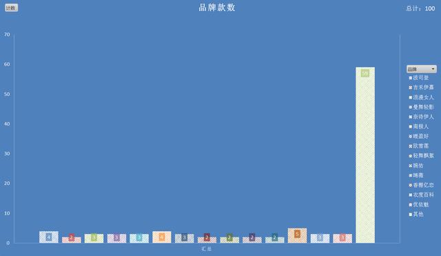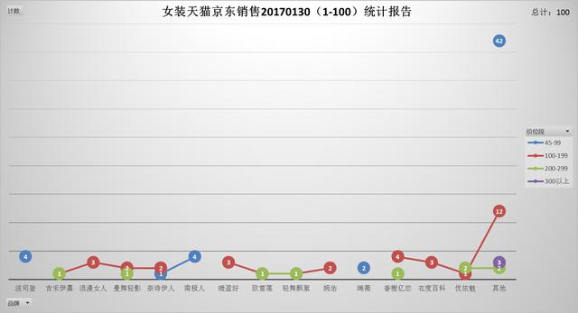 ① 在天猫京东合前100销售款中,45-99价位段款数最多的是波司登与南极人,各4款,这4款主要是女孩们的裤子、等等; ② 100-199价位销量最多的是香榭亿恋,有4款在这个价位,之后是浪漫女人、暖盈好、衣度百科各有3款; 从这几个图谱结合我们之前分析的内衣数据,我们会发现波司登与南极人这些品牌在羽绒服到内衣,再到都有他们的身影,但这些大品牌在冬天也没能抢占大部分的份额,这对于创业者,新品牌是一个好的信号,我们依然可以大胆规划我们的蓝图,设计、创作出年轻一代女孩们喜爱的具有个性化、时尚又价格合适的服装,为自己大品牌梦想打下坚牢的基础。 仁者见仁,智者见智,详情数据在以下,需要详细分析的,请自己拿去好好研究,会对你的学识、事业、创业、战略策略有所帮助。 阿什兰 2016秋冬新款加棉加厚毛呢大衣女 甜美学院小香风宽松大码外套女中长款呢大衣 红色款 S(85-100斤) 香榭亿恋2016秋冬装新款女装韩版修身毛呢针织长袖连衣裙女秋BLKE1576 土豪金 XL 浪漫女人记连衣裙女2016秋冬新款大码女装韩版修身甜美长袖针织包臀连衣裙冬1703 葡萄紫 L 轻舞飘絮连衣裙两件套2016秋冬装女新款甜美长袖针织韩版修身毛呢连衣裙女6618 灰色 M 宿图 连衣裙冬2016韩版女装秋冬新款打底裙 咖啡色格子 XL(119-128斤穿着) 优依魅毛呢外套女中长款2016秋冬新款大码女装韩版修身甜美百搭毛呢大衣女6868 灰色 M 欧雪莲2016秋冬新款中长款时尚加棉加厚呢子大衣女韩版冬装毛呢外套 红色-加棉 M 88斤-98斤 艾致倩 2016秋冬装新款毛呢外套女长款韩版修身加棉加厚狐狸毛领羊毛呢大衣 金驼色 XL含毛领 薇拉风2016春秋装新款连衣裙秋冬中长款长袖针织衫打底裙宽松冬装女韩版女装修身时尚套装蕾丝 褐色 M 曼舞轻影毛呢外套女中长款2016冬季新款女装长袖韩版修身纯色毛呢大衣女8871 墨绿色 M 晞薇 加绒打底长袖连衣裙秋冬2016新款显瘦韩版包臀加厚修身大码女装裙子中长款Q6688 加绒袖-加绒 M 晞薇 连衣裙2016秋冬季新款包臀打底连衣裙中长款高领针织衫韩版毛衣女装长袖裙子Q0205 咖啡色 M 衣度百科毛呢外套女中长款2016秋冬新款女装韩版修身甜美百搭毛呢大衣女6868 粉红色 L 吉禾伊嘉毛呢外套女中长款2017春装新款女装韩版修身纯色毛呢大衣女9212 酒红色 L-1 茵诗黛尔毛衣春款连衣裙长袖针织春装女装春2017春季新款雪纺大码打底时尚套装两件套6013 深蓝 M(均码) 欣月伊妍 2016秋冬新款大码针织毛呢 连衣裙长袖 修身打底裙打底衫女长款毛衣女 8063 灰色 均码(适合80-135斤左右) 梦雪尼亚 毛呢大衣女2016新款韩版大码加厚双面呢大衣呢子大衣毛呢外套女修身显瘦中长款 灰色 L 靓仙娜秋冬连衣裙长袖针织毛衣毛呢2017春新品新款套装女装棉麻背带沙滩包臀长裙 藏青 均码(80-120斤) 婉佑2016连衣裙 秋冬长袖针织毛衣修身半高领加厚流苏打底中长款Z829 深土黄(高领) L 北极绒(Beijirong)连衣裙2016秋冬新品针织连衣裙长袖保暖包臀裙中长款 大红色圆领 均码 口琳口琳 针织连衣裙2017春新款女装长袖修身显瘦百搭打底裙中长款气质时尚鱼尾裙子 黑色(工厂放假年后发货) L 数据每天都在变化,你看到文章时可能已有一点出入,我们只是简析,简写不好的地方请见谅!所以我们重点是提供数据给你,仁者见仁,智者见智,能让你用数据解读世界,使自己把握未来!艺智导购与数据君只做艺术般美丽动听的量子数据故事,让你在这个量子数据世界中解读出自己的的需要、知识,使自己的爱情、家庭、事业轰轰烈烈、美美满满、顺顺利利!非常感谢你的观赏与一如既往的支持,你的关注与支持是对我们辛勤劳作的肯定,是我们不断前进的动力!返回搜狐,查看更多